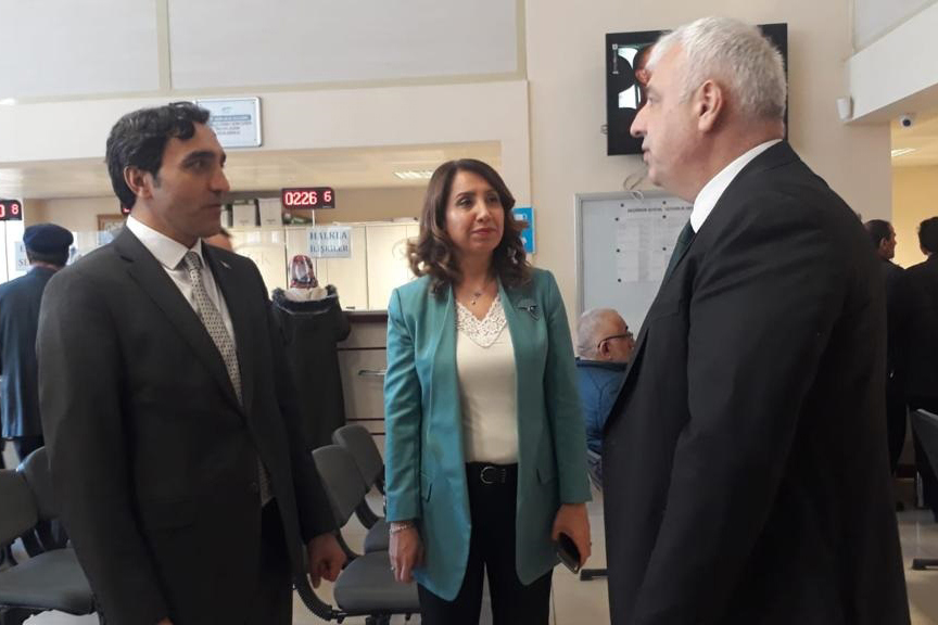 Emeklilikte Yaşa Takılanlar (EYT) ile ilgili düzenlemenin yasalaşmasıyla birlikte vatandaşların yoğun bir şekilde başvuruda bulunduğu sosyal güvenlik merkezlerinde yürütülen çalışmaları yerinde inceleyen Arat, Ankara Sosyal Güvenlik İl Müdürü Saffet Temel’den bilgi aldı.